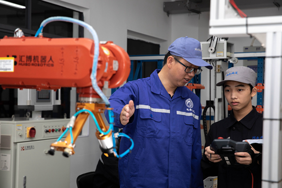 湖南铁道职业技术学院刘海龙老师指导学生进行工业机器人基础应用实训○-◆。万磊/摄