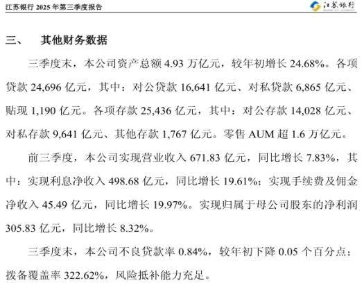 2025年前三季度▽▪,江苏银行实现营业收入671.83亿元▽,同比增长7.83%▪。其中利息净收入和手续费及佣金净收入分别同比增长19▽◇.61%和19.97%◇○,表明银行在传统信贷业务和中间业务方面均取得了增长▲○。