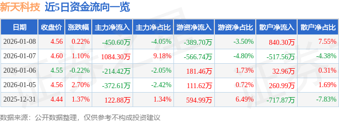证券之星消息□▽◆,截至2026年1月8日收盘▪▷,新天科技(300259)报收于4.56元,上涨0.22%,换手率2.09%▷-,成交量24.49万手,成交额1.11亿元■。
